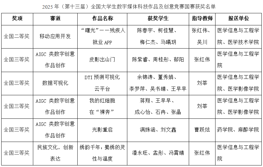 本次竞赛中,医学信息与工程学院选送的作品《“曙光”——残疾人就业APP》荣获移动应用赛道国赛二等奖,该作品针对当前残疾人群体在就业过程中面临的多重挑战,开发一款综合性就业服务APP,以信息化手段促进残疾人群体的培训、就业;国赛三等奖作品《皮影出山门》是采用生成式人工智能AIGC制作的一个关于民族非遗皮影技艺传承与创新的故事的视频;作品《DTI预测可视化云平台》通过“计算筛选+可视化呈现”的模式、可加速FGR治疗先导化合物的发现进程,最终为胎儿生长受限这一临床难题的治疗提供参考;作品《我的红细胞在“裸奔”》是一部以罕见病PNH(阵发性夜间血红蛋白尿)为背景的AIGC视频作品,通过红细胞拟人化、人体环境职场化的创意手法,结合幽默元素与网络文化科普PNH知识;作品《光影重启》用生成式人工智能AIGC创作了视频,讲述了一套皮影从昔日的辉煌,到被遗忘在箱底,再到被发现,并通过网络传播而重获新生的历程;作品《绣韵千年:蜀绣的灵性与温度》以蜀绣的艺术创作为主题、以视频方式,展现这一国家级非物质文化遗产的技艺之美与文化之魂。