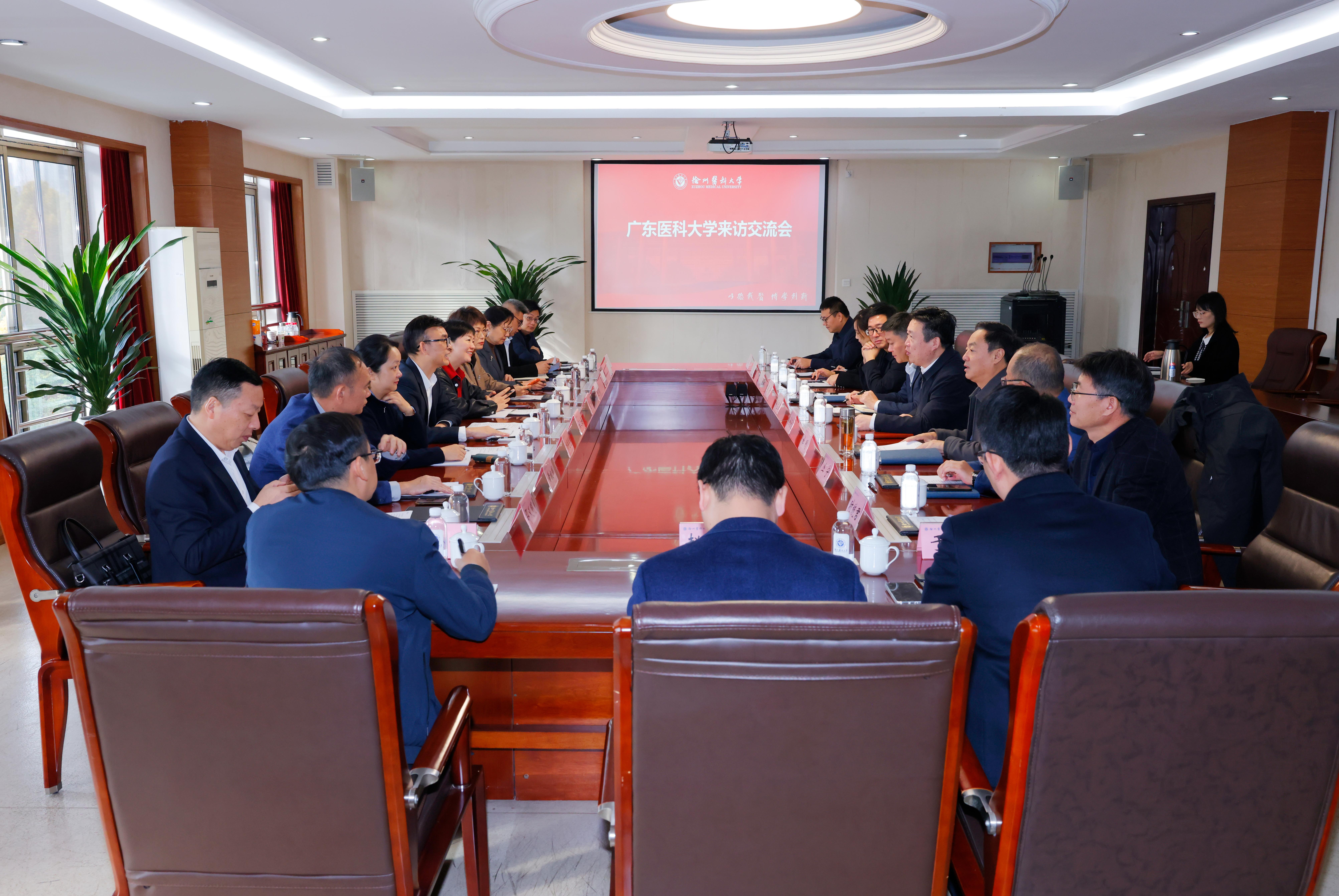 徐海波对广东医科大学一行的到访表示热烈欢迎,并简要介绍了我校的发展历程、办学特色,他指出,希望以此次交流为契机,深化互学互鉴,为学校下一步的改革发展与高水平建设注入新动力。黄达海介绍了广东医科大学的整体情况及发展实际,表示希望学习我校在教育改革与发展中的有益实践,为科学谋划“十五五”规划提供参考。之后,双方围绕党建引领、学科建设、科技创新、人事制度改革及干部队伍建设等议题展开深入探讨,并就相关领域进行了对口部门实地走访交流。