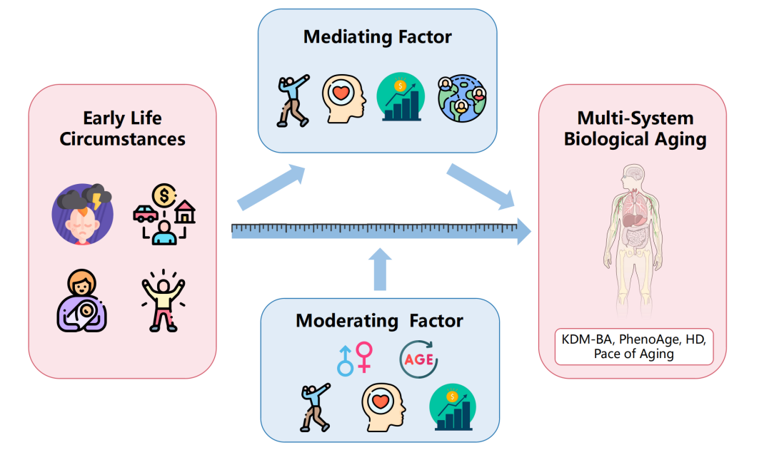 研究进一步揭示,早期生活状况的类型和时期、所使用的多系统生物衰老指标、参与者年龄及地理位置等因素,均显著影响该关联的强度。暴露评估方法、研究质量和协变量调整的方法学差异也是结果异质性的来源。此外,研究系统梳理了影响该关系的中介与调节因素。邻里和居住环境、社会经济地位、心理社会因素以及不健康的生活方式在一定程度上介导了早期生活状况与多系统生物衰老之间的关联。高龄、女性、较高的社会经济地位以及健康的生活方式能够缓解这种关联,而不良的心理社会因素则会加剧这种关联。该研究首次系统整合了早期生命状况与多系统生物衰老之间的复杂关系网络,为早期识别衰老高风险人群、制定针对性干预策略提供了重要科学依据,对推动健康老龄化具有积极意义。