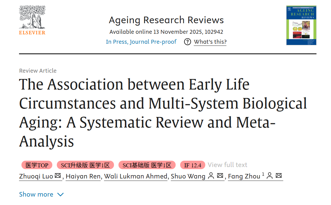 近日,我校护理学科在国际衰老领域顶级期刊《Ageing Research Reviews》(中科院1区,Top期刊,IF12.4)发表了题为《The association between early life circumstances and multi-system biological aging: A systematic review and meta-analysis》的论文。徐州医科大学为该论文唯一单位,周芳教授和王硕讲师为通讯作者,硕士生罗焯祺为第一作者。该研究受到科技部四大慢病重大专项和江苏省卫健委医学科研重点项目的资助。