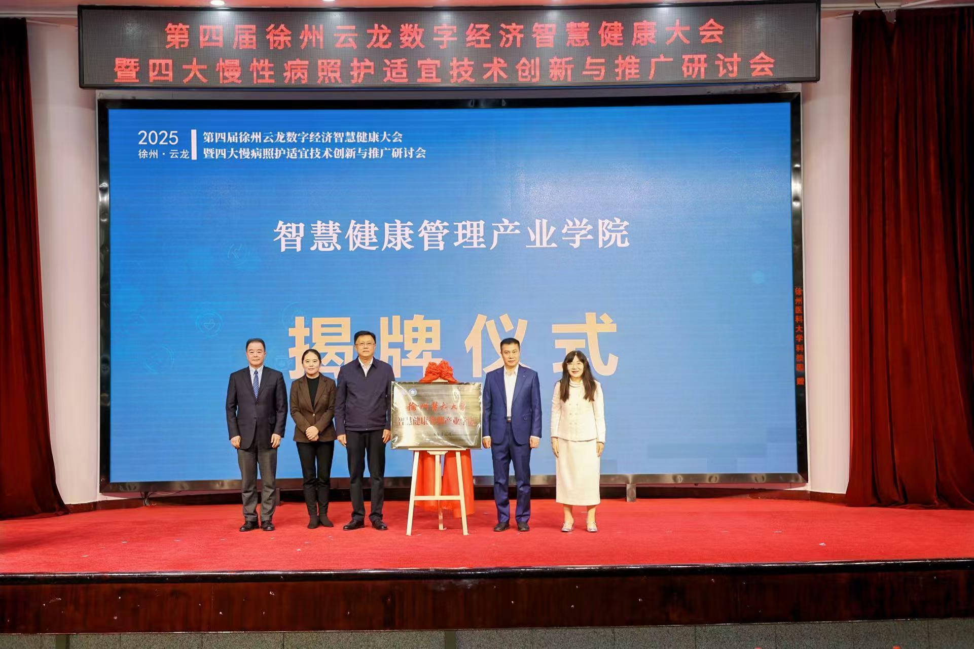 大会举行了国家科技创新2030“四大慢病”重大专项示范基地签约仪式,云龙、丰县、邳州、鄞州、射阳、保亭六地代表与课题组签署合作协议,标志着慢病防控工作从单点突破迈向区域协同新阶段。随后,智慧健康管理产业学院揭牌仪式举行,徐州市委常委、秘书长吴卫东,徐州医科大学党委常委、副校长刘慎军教授等领导共同揭牌。吴卫东在总结讲话中表示,徐州市将持续优化政策服务环境,将徐州打造为慢病照护适宜技术的创新策源地,为健康中国贡献徐州智慧。