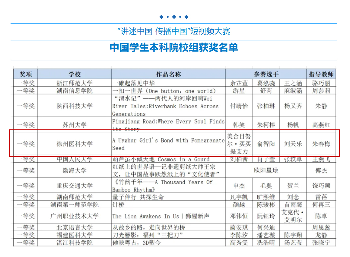 第八届“外教社杯”全国高校学生跨文化能力大赛近日落下帷幕。该项赛事分为短视频和团队现场赛两种比赛形式。在短视频赛中,我校学子美合日努尔·买买提艾力(医学影像学院)、俞智阳(麻醉学院)、刘天乐(第一临床医学院)团队的作品在全国2500多个作品中脱颖而出,荣获国赛一等奖;在团队现场赛中,孔陆依(麻醉学院)、孙翊(第一临床医学院)、赵陆明阳(第二临床医学院)团队荣获省赛一等奖。