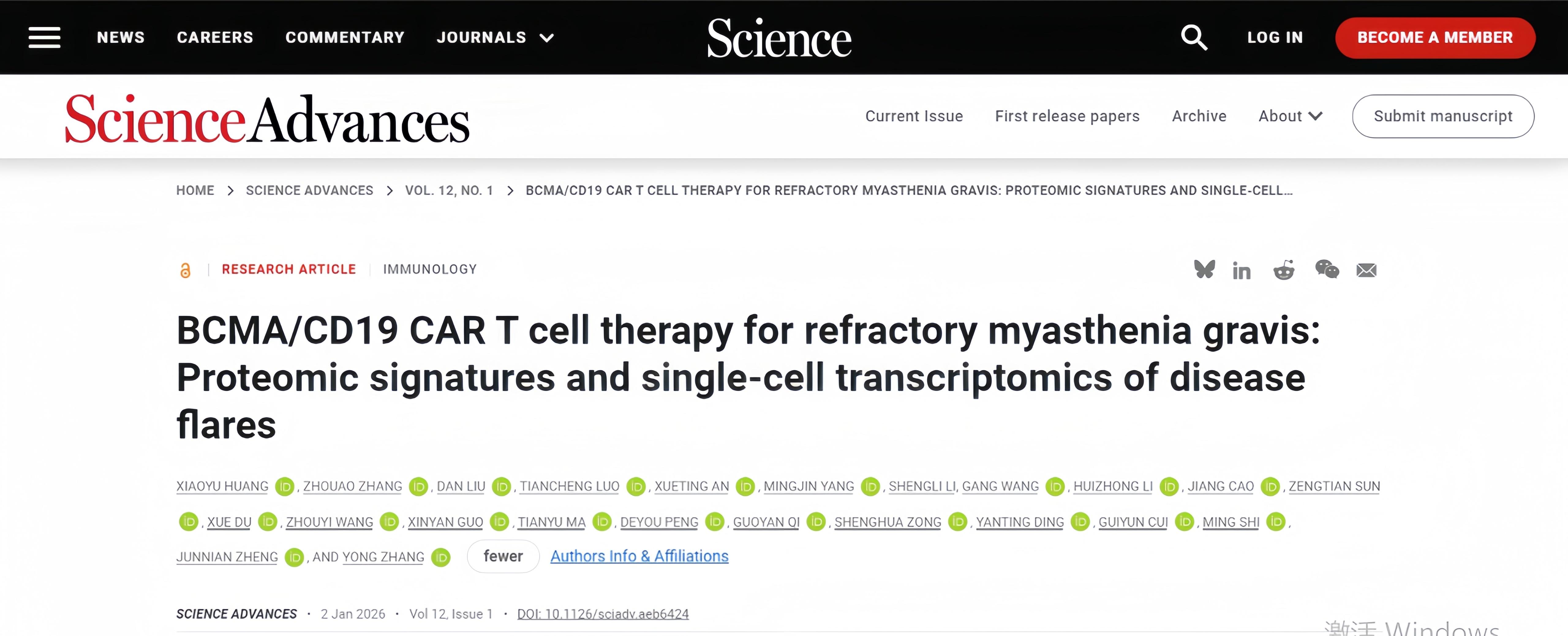 1月2日,徐州医科大学附属医院神经内科崔桂云教授、张勇教授团队联合徐州医科大学肿瘤研究所施明教授团队,在国际顶级期刊《Science Advances》在线发表了题为“BCMA/CD19 CAR T cell therapy for refractory myasthenia gravis: proteomic signatures and single-cell transcriptomics of disease flares”的研究论文,标志着徐医附院高水平基础与临床研究领域取得了新的突破。