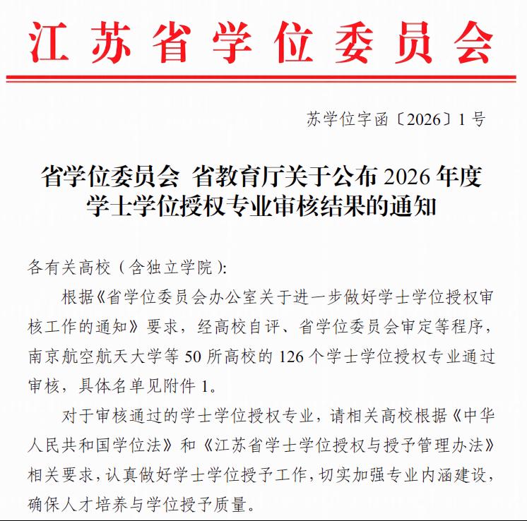 近日,省学位委员会、省教育厅正式印发《2026年江苏省通过审核的学士学位授权专业名单》。我校医疗器械与装备工程专业顺利通过学士学位授权审核,正式增列为学士学位授权专业。